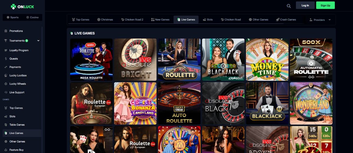 34 total💡OnLuck aggregates content from 69 game providers including Pragmatic Play, BGaming, Playtech, Hacksaw Gaming, and Games Global. The live casino runs primarily on Pragmatic Play Live with Playtech tables visible. Strong coverage of crypto-friendly studios like Spribe and BGaming for crash games. Missing some major names like NetEnt and Evolution Gaming from visible provider lists.