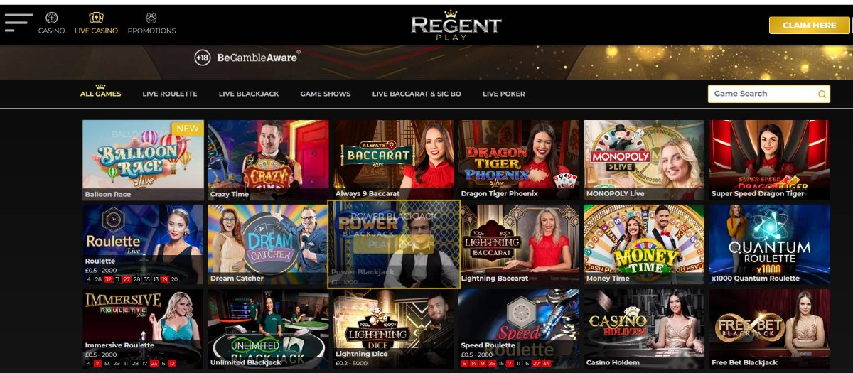 59 totalTIP:Regent Play aggregates games from 59 software providers through the Pariplay Fusion platform, including industry leaders like NetEnt, Play'n GO, Evolution Gaming, Pragmatic Play, Microgaming, and Blueprint Gaming. The library exceeds 1,000 titles spanning slots, live dealer games, table games, jackpots, and scratch cards. Evolution Gaming powers the live casino section with Lightning Roulette, Crazy Time, and Monopoly Live among the highlights. Popular slots include Book of Dead, Starburst, Big Bass Bonanza, and Legacy of Dead.