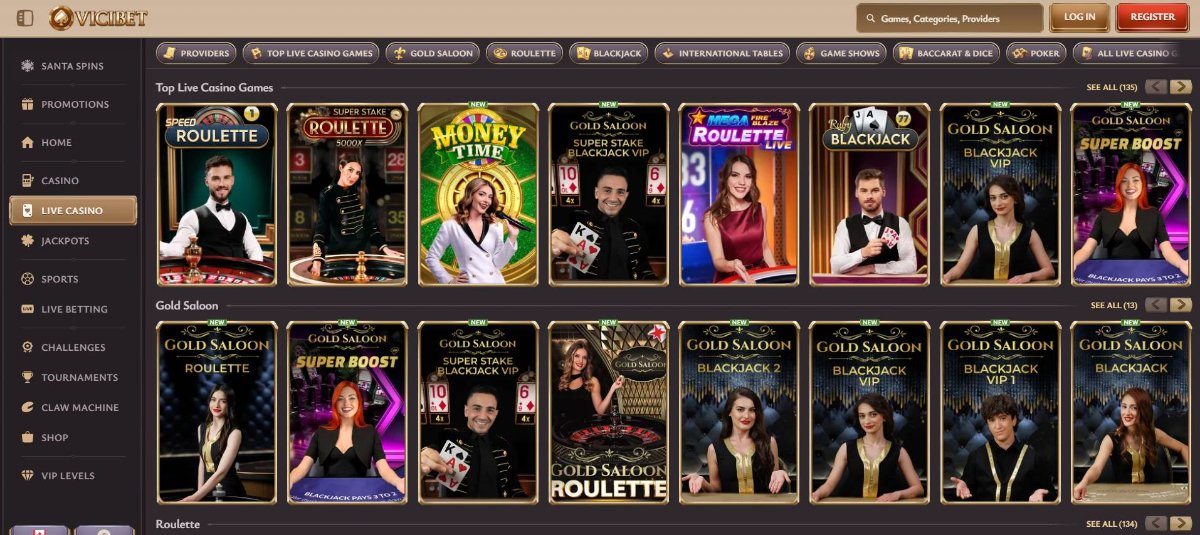 Evolution Gaming powers the live dealer section, supplemented by Ezugi and the casino's "Gold Saloon" branded tables. Current count: 135 top games, 134 roulette variants, 13 Gold Saloon exclusives.